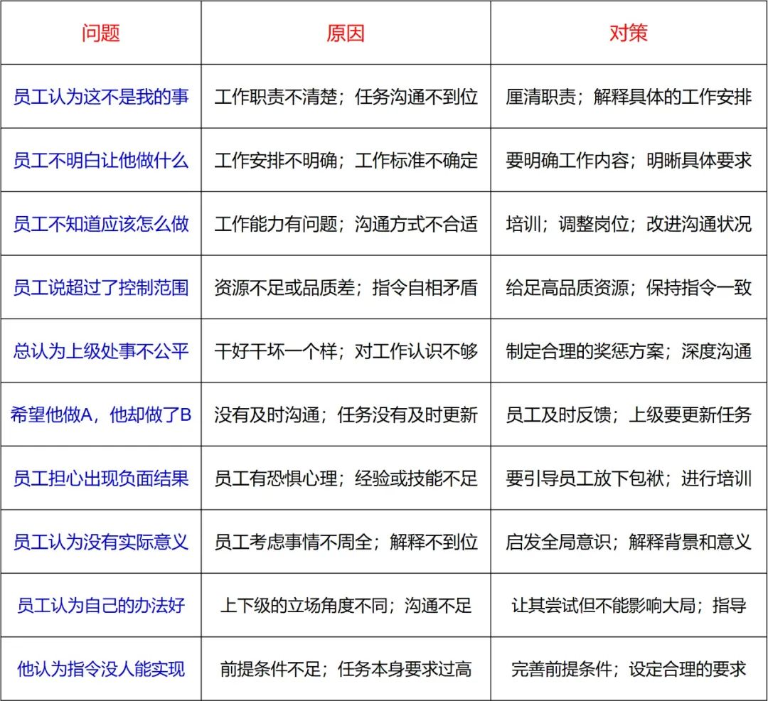 接下来,我们就分析上述问题的成因,看看怎么解决这些问题。这一问题的成因是:员工不清楚自己的工作职责;上级在交代任务时沟通不到位。所以,上级要给下级一份清晰的工作职责说明,同时,在安排工作时,说明任务的必要性、关联性并激发员工的责任感。这一问题的成因是:工作安排不明确;工作标准不确定。安排工作时,没有组织好信息,所以,员工不得要领。或者,没有提出明确的工作标准,所以,员工不知道做到什么程度。因此,在安排工作时,不但要组织好语言,还要提出具体要求,以利于下级理解和工作追踪。这一问题的成因是:工作能力有问题;沟通方式不合适。对员工能力的培育,功夫要下在平时。从思维能力、人际能力、专业能力以及管理能力四个方面去培养员工。同时,要注意改进沟通方式,比如,先把工作分解到很容易理解的程度,员工就容易接受了。这一问题的成因是:完成任务的资源不足或品质差;上级下达的指令自相矛盾。要为员工完成提供足够的资源,同时要注意保证资源的品质。有些事情,需要上级出面去协调,因为下级在职位上跟对方不对等。要特别注意的是,上级在安排工作时要前后一致,不能自相矛盾,否则,员工会感觉不知所措、力不从心。这一问题的成因是:干好无奖励,干坏无惩罚;员工对工作的认识不够。一个团队,一个组织,提倡什么,反对什么,要让每个成员了解,要制定合理的奖惩方案。对员工各自的责任范围、工作要求,要有明确界定和深度沟通。这一问题的成因是:双方确认和反馈;工作任务没有及时更新。在布置工作时,一定要听听下级的反应。在任务执行过程中,下级要及时反馈。如果任务发生变更,哪怕是工作标准提高了,上级也要及时告知下级。这一问题的成因是:员工有恐惧心理;经验或技能不足,担心做不好事情。员工有恐惧心理,是因为曾经看到其他同事因完不成类似任务而被严厉批评或处罚过。所以,这就要求上级要对下级有一定的包容性,引导员工放下思想包袱。同时,要让有经验的员工带一带那些经验不足的员工,或者,上级亲自培养。这一问题的成因是:员工考虑事情不周全;上级解释不到位。因此,上级要启发下级的全局意识,帮他们树立大局观。另外,上级要解释工作的背景和意义,与下级达成共识、形成共鸣。这一问题的成因是:下级立场和角度不同;沟通不足。可以让员工按照自己的办法去尝试,但要控制风险,不能影响大局。如果下级的办法确实好,就要推广他的做法,他会收获成就感。如果下级的办法有问题,就要抓住时机,进行指导,做好员工的培养工作。这一问题的成因是:前提条件或资源不足;上级的要求过高。所以,上级在安排工作时,要考虑条件是否成熟、资源是否充足。另外,在安排工作时,要根据员工的成熟度来,设定合理要求。