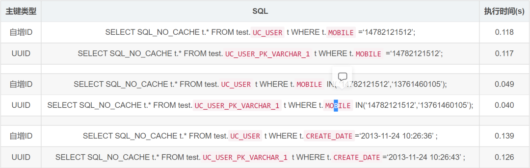 3、在范围查询做统计汇总的时候,自增id主键的效率是uuid主键1.5到2倍;