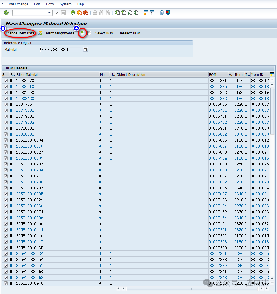 一个工厂或者多个工厂的所有包含A组件物料的BOM需要将组件物料A批量替换成B,请问如何处理?使用cs20事务码即可。在SAP起始页按下ctrl + /快捷键定位到事务码运行框,输入cs20,按下回车键。输入旧的组件物料编码(见①),输入工厂编码(见②),输入星号代指所有工厂,选择BOM类型(见③),选择具体操作(见④,一定是选择Change Item Data),输入替换后的新组件物料编码(见⑤),点击运行(见⑥,快捷键F8)。全选查找出来的BOM(见?,快捷键Ctrl+F5),点击Change Item Data(见?,快捷键是F8)。下图显示的BOM奇数行和偶数行颜色不一样,让行与行之间容易区分,设计比较贴心。提示已经选中了多少BOM,是否修改,点击Yes。窗口底部状态栏提示