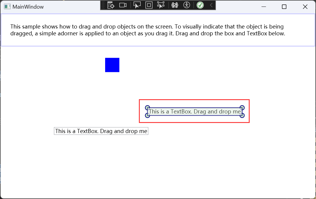 <TextBox Text="This is a TextBox. Drag and drop me" Canvas.Top="100" Canvas.Left="100"/>