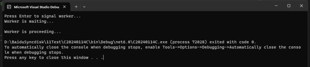 Console.WriteLine("Press Enter to signal worker..."); Console.ReadLine(); // 等待用户输入,模拟某个事件的发生