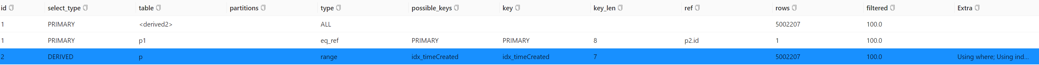 我们综合上述的执行计划可以看出,子查询 table p查询是用到了idx_timeCreated索引。首先在索引上拿到了聚集索引的主键ID,省去了回表操作,然后第二查询直接根据第一个查询的 ID往后再去查10个就可以了!