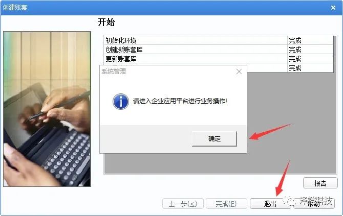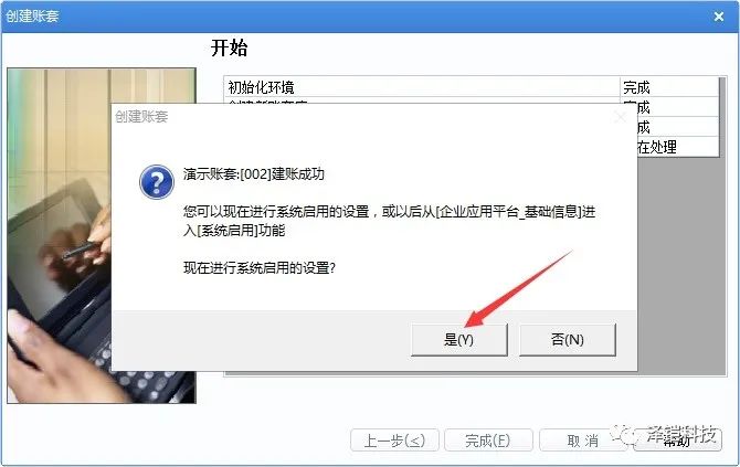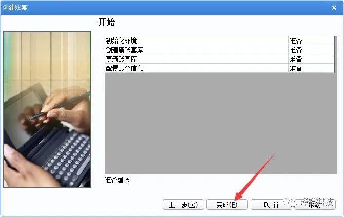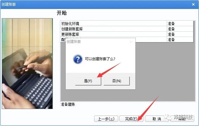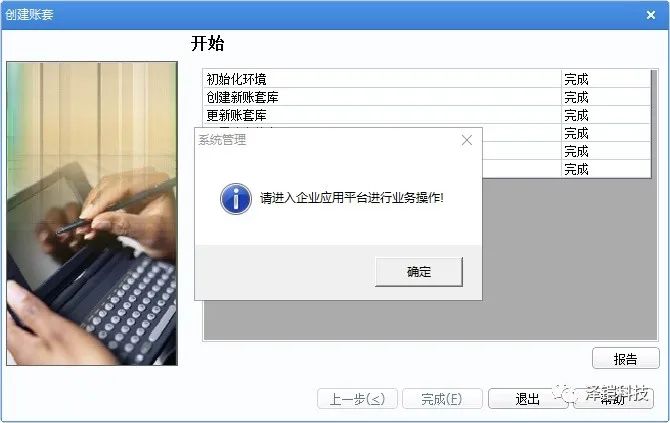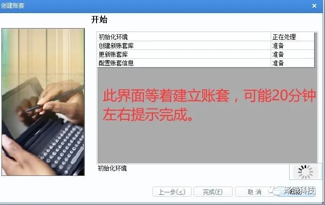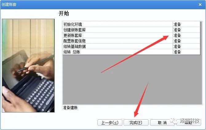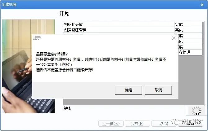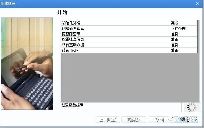 如果第4步中检查全部通过,可以〖下一步〗开始建账,系统显示建帐的主要步骤的执行进度,如初始化环境、创建新账套库、结转基础数据、结转各个业务产品数据等等。点击〖完成〗按钮,提示"可以创建账套了么",点击"是"完成上述信息设置,开始建账;点击"否"返回确认步骤界面;点击〖上一步〗按钮,返回第4步设置;点击〖取消〗按钮,取消此次建账操作。