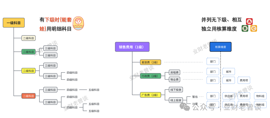 会计科目是业务事项按会计准则要求的一种归纳或分类,是在会计要素基础上的一种细分,包括科目编码和科目名称;在高级的ERP中,科目名称支持多种语言,可灵活切换,如中文、英语、维吾尔语等。 会计科目的内容反映科目之间的横向联系,会计科目的级次(层级)是以会计科目编码为载体,反映科目内部的纵向关系。比如1002是“银行存款”科目,100201 “工行”是银行存款下的明细(二级)科目,全称为“银行存款_工行”,他俩为父子关系。 会计科目编码要点会计科目编码由数字构成,国内ERP的科目编码有层级关系,如一级、二级、三级,国外ERP如SAP也有层级,但Oracle则用弹性域实现的(类似字段),国内外ERP有些区别,本文如无特例说明均指国内ERP。 一级科目编码一般为4位,也有3位,第一位为账户性质,就好像我们名字的姓一样,是一种分类,表示其是属于资产类还是负债类,开头1是资产、2是负债、3是共同类、4为权益类、5为成本类、6为损益类。 会计科目级次(层级)关系会计科目的级次主要为方便不同的使用者,如管理层和外部信息使用者(如审计)只需关心一级科目,了解粗略数据,如应收账款多少、应付账款多少;而具体财务人员则需要根据明细科目进行具体分析,检视经营成果。 企业可灵活设立多个层级,如二级、三级及至五级、六级,从使用角度与便利性考量,一般不超五级。 会计科目级次模式: a、422式,科目编码级次为4-2-2-2:即除一级科目由四位数字组成外,其他各级的编码均为两位数字,科目全称用下划线将多级连接起来,如100102 银行存款_建行。这种设置清晰、一目了然。 b、423式,即一级科目编码是4位数字,二级编码是2位数字、三级编码是3位数字,如还有四级则是4位数字,依此类推,这种从科目编码看有层次感。 c、322式,一级科目的编码是3位数字,二级科目的编码是2位数字,以此类推。 总之,会计科目的编码级次是根据会计管理的需要和科目分类的逻辑来设计的。不同的编码级次适用于不同的管理需求和科目细分要求,确保了会计信息的准确性和可追溯性,在账套开启时设定后不允许修改。在我国一般为422式。 总账科目(统驭科目)与明细科目1、总账科目 在SAP也称统驭科目,指一级科目,是财政部制定的,实质是会计要素(资产、负债、所有者权益、成本、损益)的反映,企业可以根据业务所需灵活设定。 总账科目主要是用于生成法定财务报表,它们与法定财务报表的每一行有映射关系,但可能是多对一,即几个一级会计科目对应着报表的一项; 总账科目在系统实现层面就是一张总账汇总表。 以最新会计准则为例,总账科目主要有以下几种: 2、明细科目 一级以下的科目为明细类科目,只需满足会计要素在交易层面最细的分类要求,即每笔会计凭证上出现的最细的科目,可以由企业自行设置。明细科目只允许末级科目可以在分录中记账,中间的科目仅做分类、汇总使用,如下图: 科目设置与管理1、集团统筹下的多公司主体科目管理 企业出于税务筹划或战略发展要求,会设立多个公司主体,比如美团以美团科技有限公司为核心企业之一,设立几十家公司主体,如江苏三快在线科技有限公司、深圳三快信息科技有限公司、湖南三快在线科技有限公司等等;这么多公司对科目管理提出较高要求,在迅速支撑会计核算的同时,确保科目创建的科学性、可持续,避免同一科目出现多个编码或名称,否则给报表编制、合并报表等工作带来不小的麻烦。 对于集团下多公司主体时,一般每个主体会单独设立账套。每个账套的会计科目,无论编码还是名称,均要求三“统一”:统一创建、统一分配、统一回收; 2、科目管理规则与职责要求 科目管理,应由专人审核专人在集团层面创建,再分配给所需的账套;三级及以上科目禁止从各主体账套自行创建。同时负责审核科目的岗位应是中、高阶财务岗,具有全局视角与管理会计思维。 比如管理费用下设二级科目“水电气暖费”,然后在下面又设了几个三级科目:水费、电费、燃气费、供暖费。这样设三级科目,不如取消“水电气暖费”二级科目,直接把水费、电费、燃气费、供暖费都设为管理费用下的二级科目。 是否需要设“水电气暖费”这个二级科目,要考虑它有什么用,是否只起到加总四个三级科目发生额直接取数的作用?其实多数公司设这种仅起汇总作用的二级科目,只是因为最初管理需求不需要单独看水、电、气、暖的费用,所以觉得既然它们都属于办公室里发生的公用事业支出,就设一个科目即可,但没想到后来需要单独看了,所以就只好在它下面新加几个三级科目。 出现这种情况,一是因为设会计科目时并未深入洞察管理需求;二是因为公司由于业务规模和复杂度发展所以管理精细度在不断提升,造成以前的科目设置粗放而无法满足取数的要求。这些都对维护人员提出较高要求,要有一定经验与前瞻性。 3、科目级次与核算维度 前面我们知道明细科目是一级科目的细分,在核算中还有一个概念,核算维度(也称辅助项目、核算项目)。维度是财务管理中一个关键概念,它指的是对财务数据进行分析和报告时使用的一个或多个分类标准。它允许企业从不同的角度切入,对财务数据进行多维度的分析和解读。通过维度,企业可以更深入地理解财务数据背后的业务活动,支持更复杂的决策需求。 科目与维度构成了财务报告和分析的基础,确保