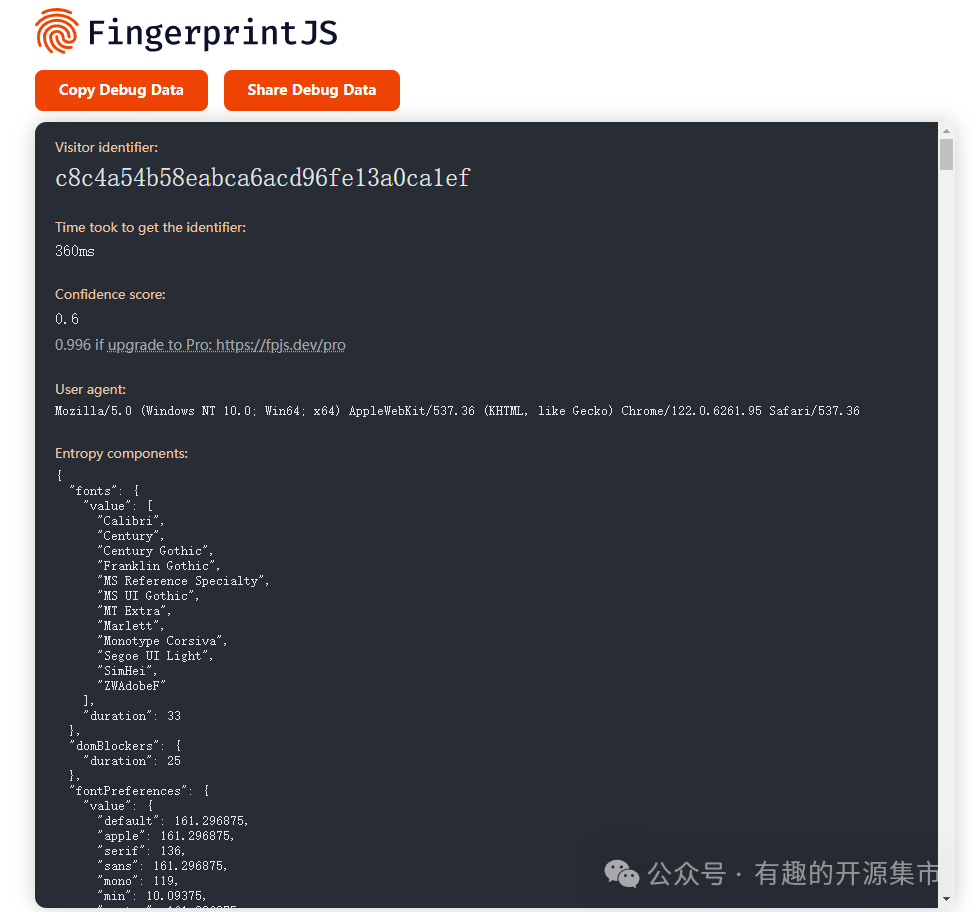 FingerprintJS 还提供了一些配置选项,允许自定义指纹生成过程。例如,可以排除某些组件: