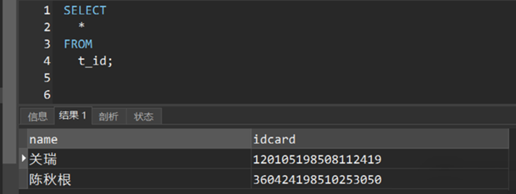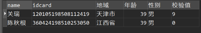 SELECT   `name`,   idcard,CASE      LEFT ( idcard, 2 )       WHEN '11' THEN '北京市'       WHEN '12' THEN '天津市'       WHEN '13' THEN '河北省'       WHEN '14' THEN '山西省'       WHEN '15' THEN '内蒙古自治区'       WHEN '21' THEN '辽宁省'       WHEN '22' THEN '吉林省'       WHEN '23' THEN '黑龙江省'       WHEN '31' THEN '上海市'       WHEN '32' THEN '江苏省'       WHEN '33' THEN '浙江省'       WHEN '34' THEN '安徽省'       WHEN '35' THEN '福建省'       WHEN '36' THEN '江西省'       WHEN '37' THEN '山东省'       WHEN '41' THEN '河南省'       WHEN '42' THEN '湖北省'       WHEN '43' THEN '湖南省'       WHEN '44' THEN '广东省'       WHEN '45' THEN '广西壮族自治区'       WHEN '46' THEN '海南省'       WHEN '50' THEN '重庆市'       WHEN '51' THEN '四川省'       WHEN '52' THEN '贵州省'       WHEN '53' THEN '云南省'       WHEN '54' THEN '西藏自治区'       WHEN '61' THEN '陕西省'       WHEN '62' THEN '甘肃省'       WHEN '63' THEN '青海省'       WHEN '64' THEN '宁夏回族自治区'       WHEN '65' THEN '新疆维吾尔族自治区'       WHEN '71' THEN '台湾省'       WHEN '81' THEN '香港特别行政区'       WHEN '82' THEN '澳门特别行政区' ELSE '未知'    END AS 地域,   YEAR (   curdate()) -IF   (      length( idcard ) = 18,      substring( idcard, 7, 4 ),   IF   ( length( idcard ) = 15, concat( '19', substring( idcard, 7, 2 )), NULL )) AS 年龄,CASE   IF      (         length( idcard ) = 18,         cast( substring( idcard, 17, 1 ) AS UNSIGNED )% 2,      IF      ( length( idcard )= 15, cast( substring( idcard, 15, 1 ) AS UNSIGNED )% 2, 3 ))       WHEN 1 THEN '男'       WHEN 0 THEN '女' ELSE '未知'    END AS 性别,CASE      ((            SUBSTRING( idcard, 1, 1 )* 7             )+(            SUBSTRING( idcard, 2, 1 )* 9             )+(            SUBSTRING( idcard, 3, 1 )* 10             )+ ( SUBSTRING( idcard, 4, 1 )* 5 )+(            SUBSTRING( idcard, 5, 1 )* 8             )+(            SUBSTRING( idcard, 6, 1 )* 4             )+ ( SUBSTRING( idcard, 7, 1 )* 2 )+(            SUBSTRING( idcard, 8, 1 )* 1             )+(            SUBSTRING( idcard, 9, 1 )* 6             )+ ( SUBSTRING( idcard, 10, 1 )* 3 )+(            SUBSTRING( idcard, 11, 1 )* 7             )+(            SUBSTRING( idcard, 12, 1 )* 9             )+ ( SUBSTRING( idcard, 13, 1 )* 10 )+(            SUBSTRING( idcard, 14, 1 )* 5             )+(            SUBSTRING( idcard, 15, 1 )* 8             )+ ( SUBSTRING( idcard, 16, 1 )* 4 )+(            SUBSTRING( idcard, 17, 1 )* 2          )) % 11       WHEN 0 THEN '1'       WHEN 1 THEN '0'       WHEN 2 THEN 'X'       WHEN 3 THEN '9'       WHEN 4 THEN '8'       WHEN 5 THEN '7'       WHEN 6 THEN '6'       WHEN 7 THEN '5'       WHEN 8 THEN '4'       WHEN 9 THEN '3'       WHEN 10 THEN '2' ELSE '未知'    END AS 校验值 FROM    t_id;