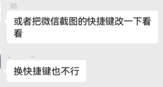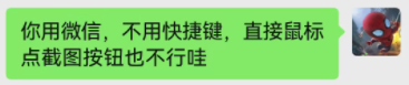 于是我建议让他手动点击微信的截图按钮,不要敲键盘,结果还是不行:
