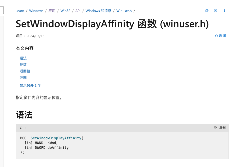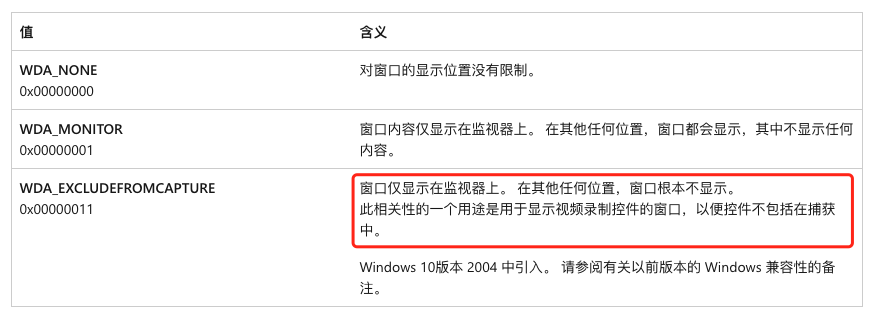 于是我打开ChatGPT,把上面的现象给它描述了一下,他告诉了我一个系统API,这个API可以办到这样的效果,这个API就是:SetWindowDisplayAffinity