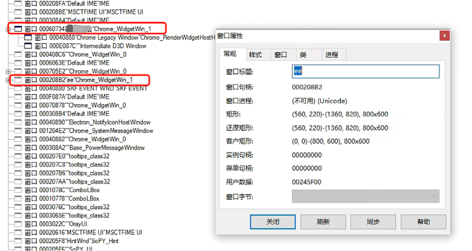 我们先用Spy++看一下要解除保护的窗口,通过上面APImonitor中抓到的两次调用SetWindowDisplayAffinity函数所设置的两个窗口句柄值在Spy++中找到这两个窗口: