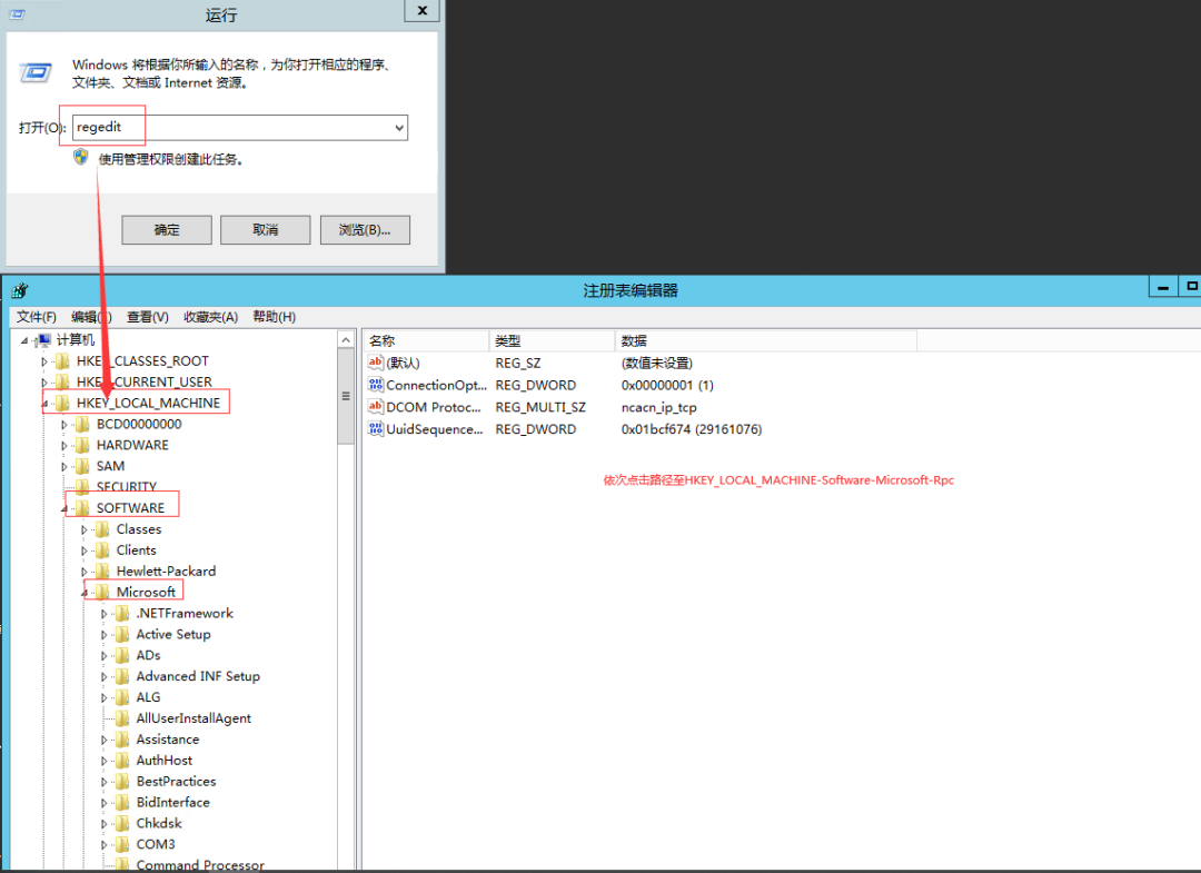 2)、注册表修改定位到HKEY_LOCAL_MACHINE\SOFTWARE\Microsoft\Rpc新建项“Internet”,并重启。
