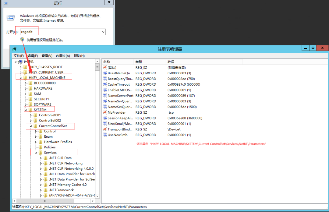 • 进入HKEY_LOCAL_MACHINE\SYSTEM\CurrentControlSet\services\NetBT\Parameters,新建一个名为“SMBDeviceEnabled”的多字符串值,设置为0。