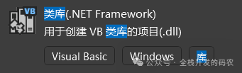 首先,在Visual Studio里创建一个VB类库项目,如下图所示。注意选择的是含有.NET Framework、VB和Windows这三个特征的那种类库,不要选成“通用windows”类库。项目名称可使用默认的ClassLibrary1,当然也可以自行命名。