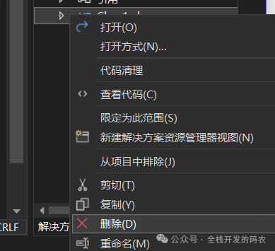 创建好项目后,程序自动打开项目,可在资源管理器里看到当前项目已自动创建了一个类Class1。右键选中这个Class1,删除它。