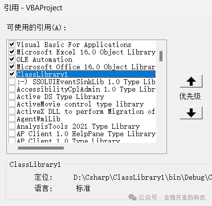 此时,新建一个Excel文件,打开开发工具,新建一个Visual Basic模块,在编辑器的主菜单中选择“工具”-->"引用"就可以看到ClassLibrary1已经被添加到引用里,勾选ClassLibrary1,如下图。