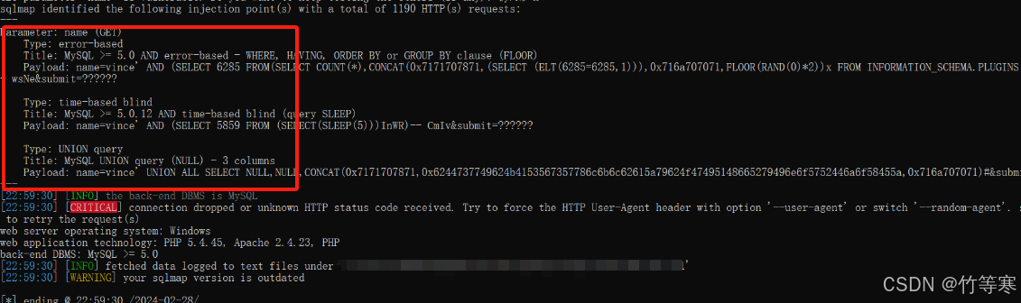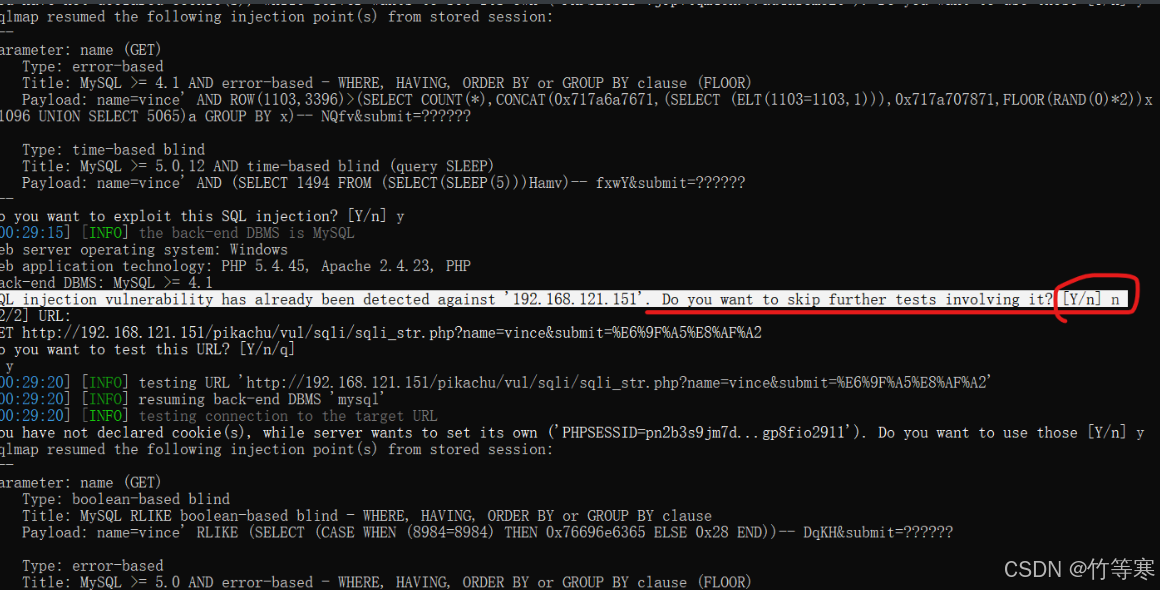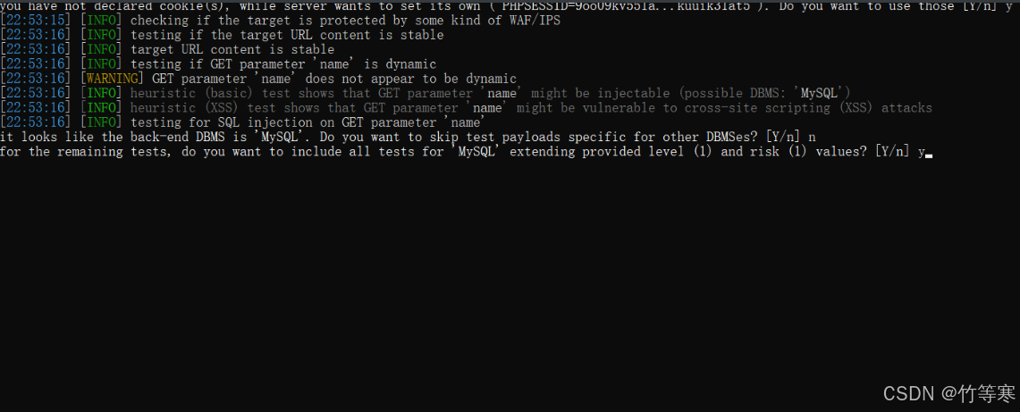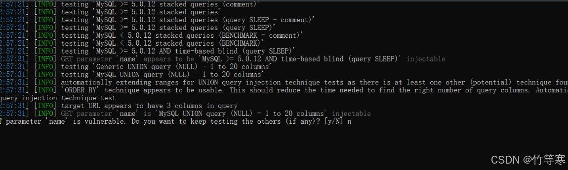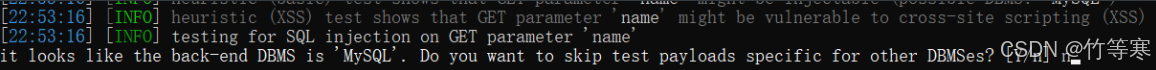 • 1:sqlmap测试出来时哪个数据库的时候会提示你是否还继续测试其他数据库的payload注入语句,这里一般输入n,你不放心就可以y