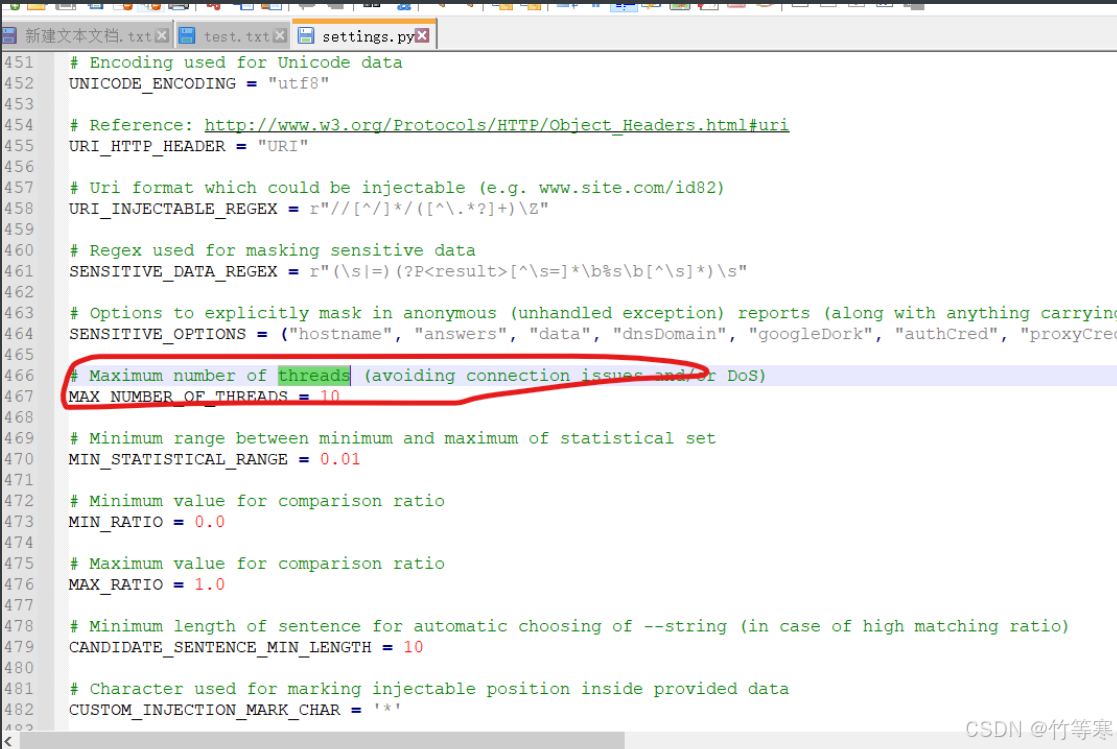 • 注意:这个默认线程数量在 sqlmap文件夹\lib\core\setting.py 中,修改其中的MAX_NUMBER_OF_THREADS = 10,也就是说你使用--threads 指明的线程数最大也就10,想要指定更大的就修改配置文件。(一般不需要很大,不然对方服务器也顶不住这么大的请求数量。甚至还有可能封你ip)