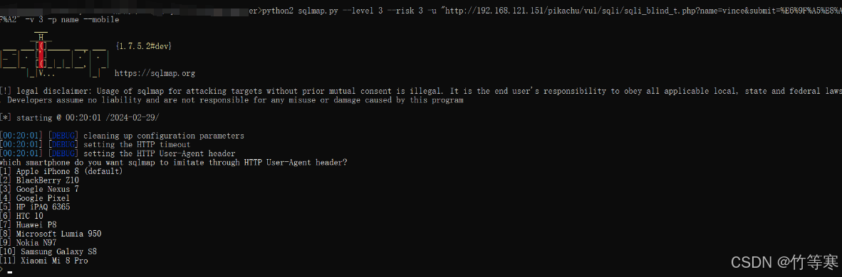 直接加上--mobile即可,他会自动让你选择手机型号,不用自己输入手机型号(所以也有局限性,但是也不算局限性,市面这么多手机,只要能够让网站判断是手机访问的即可了)