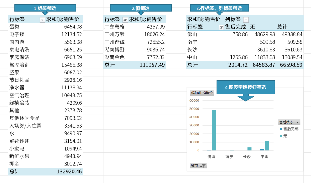 即使再强大的功能,一个画面呈现过多信息,容易造成大家接受信息过载。 我们可以通过筛选让数据更简洁,分段展示出重点。透视表筛选多达7种选项:标签筛选、值筛选、列标签筛选,图表字段按钮筛选、筛选区筛选、切片器筛选、日程表筛选。