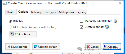 Options选项,默认是RDP文件。这儿可以做一系列的配置,感兴趣自行探索。如果你需要打包成安装包,就需要下载额外的工具来集成,此处我也不演示这部分。