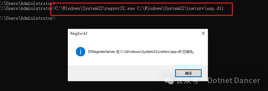 接着,打开cmd,管理员权限打开,注册asp。输入命令