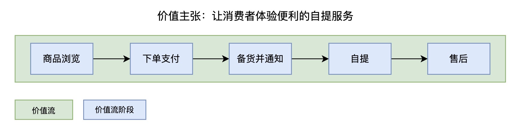 • 价值流阶段:整个价值链由5个阶段组成,分别为商品浏览、下单支付、备货并通知、自提、售后。