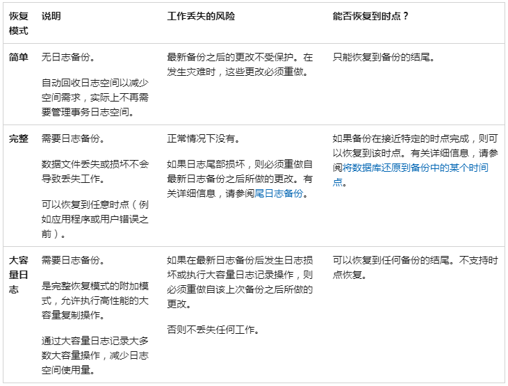 下表概述了这三种恢复模式的基本信息情况供参考:
