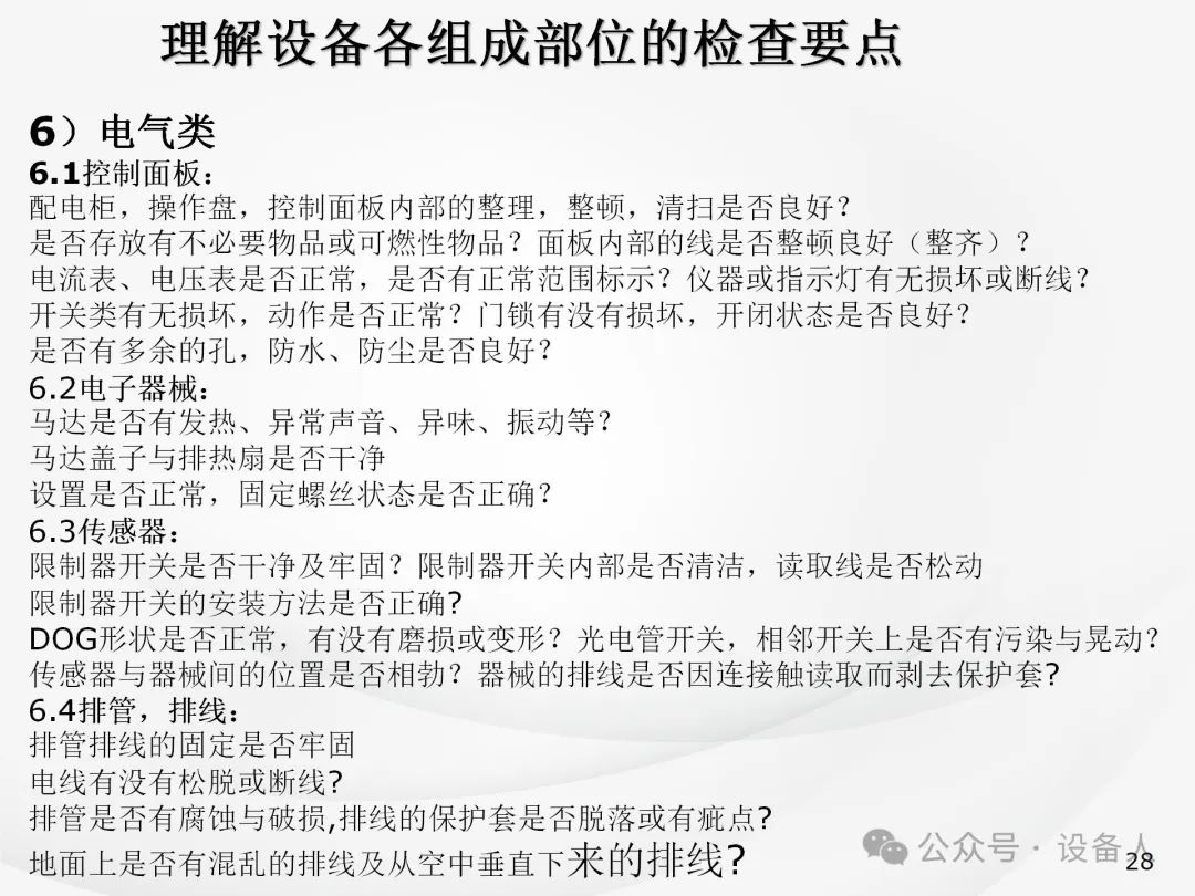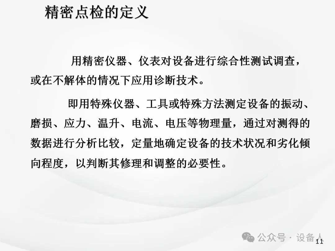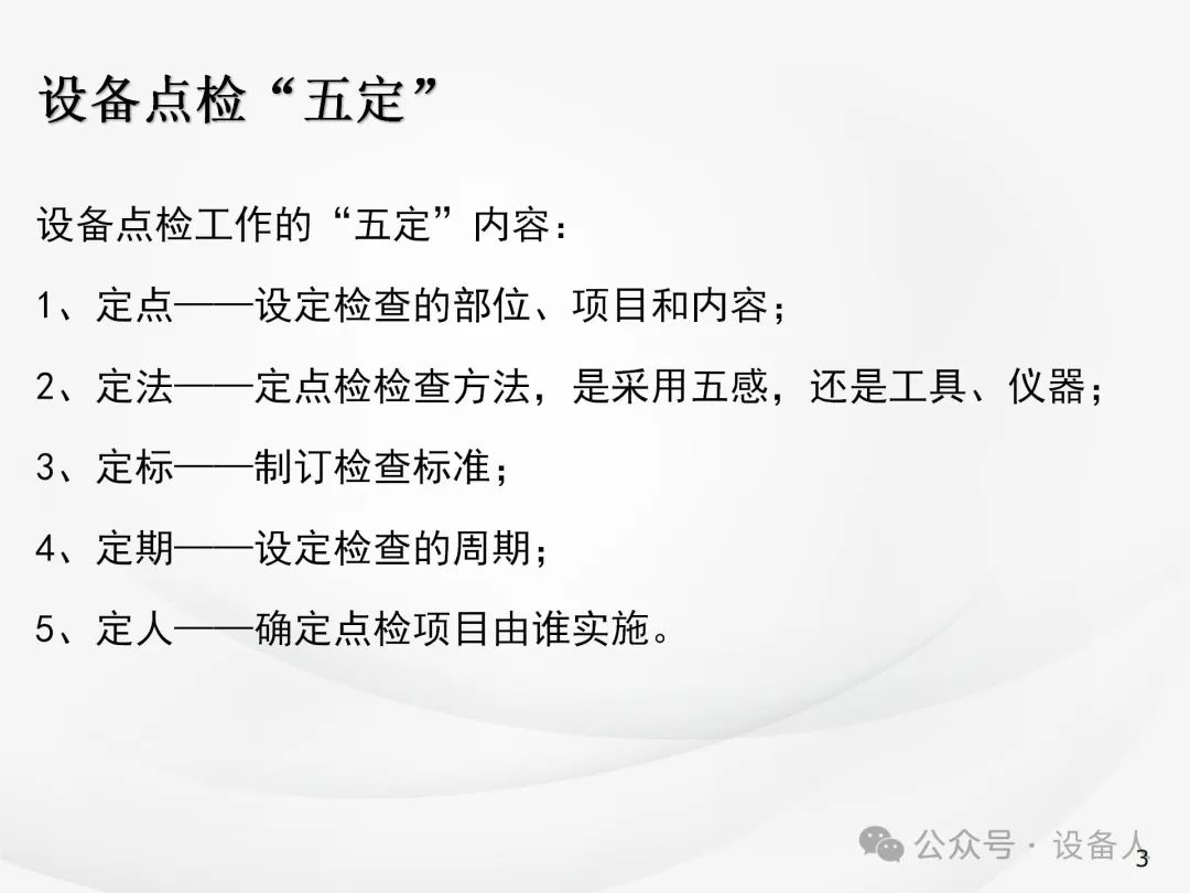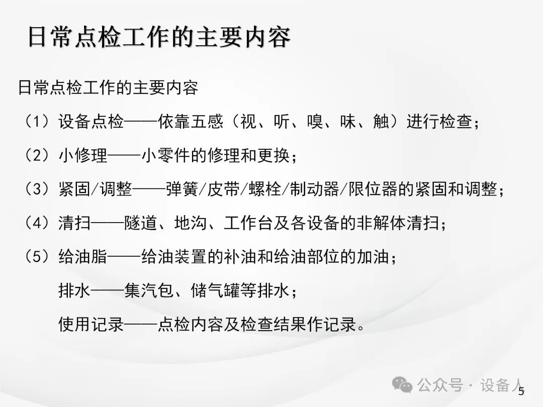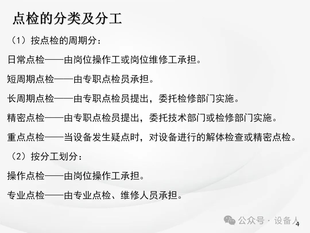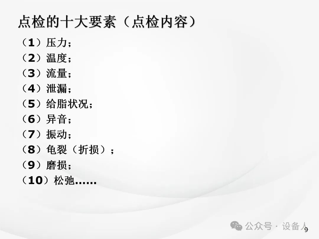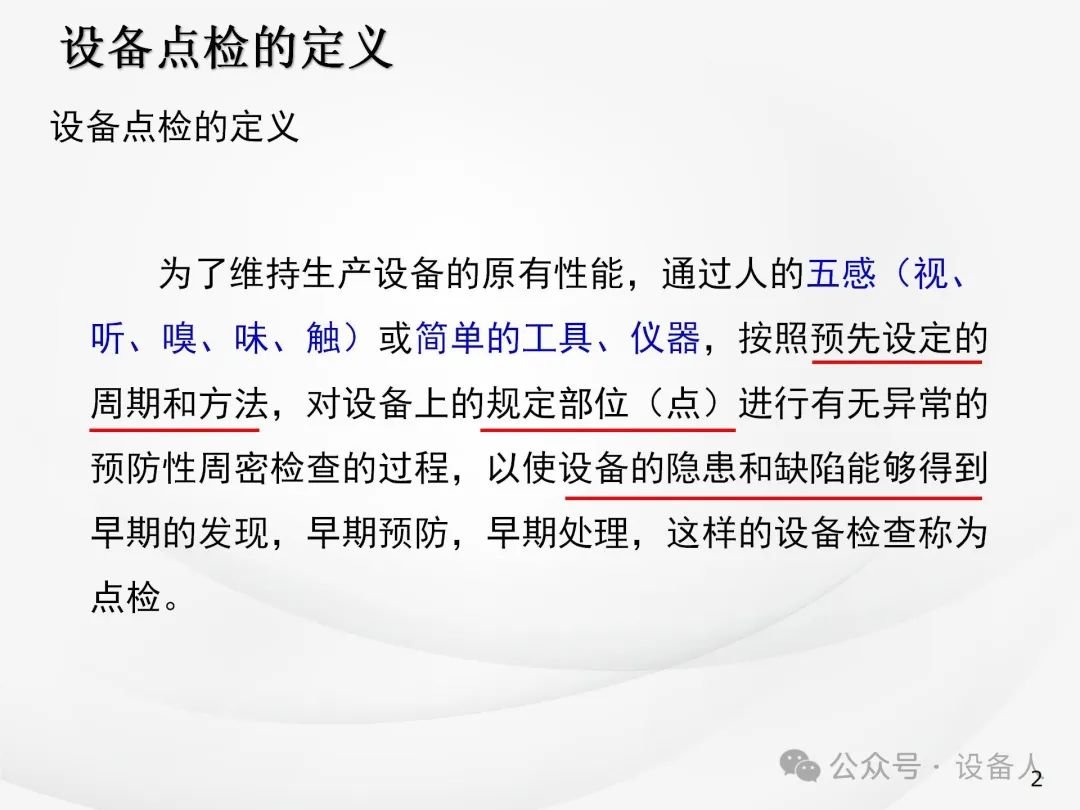 为了维持生产设备的原有性能,通过人的五感(视、听、嗅、味、触)或简单的工具、仪器,按照预先设定的周期和方法,对设备上的规定部位(点)进行有无异常的预防性周密检查的过程,以使设备的隐患和缺陷能够得到早期的发现,早期预防,早期处理,这样的设备检查称为点检。