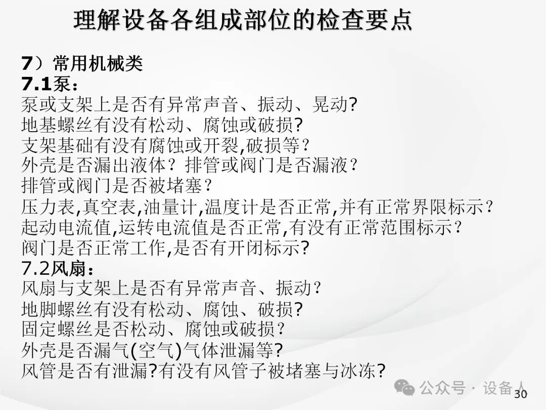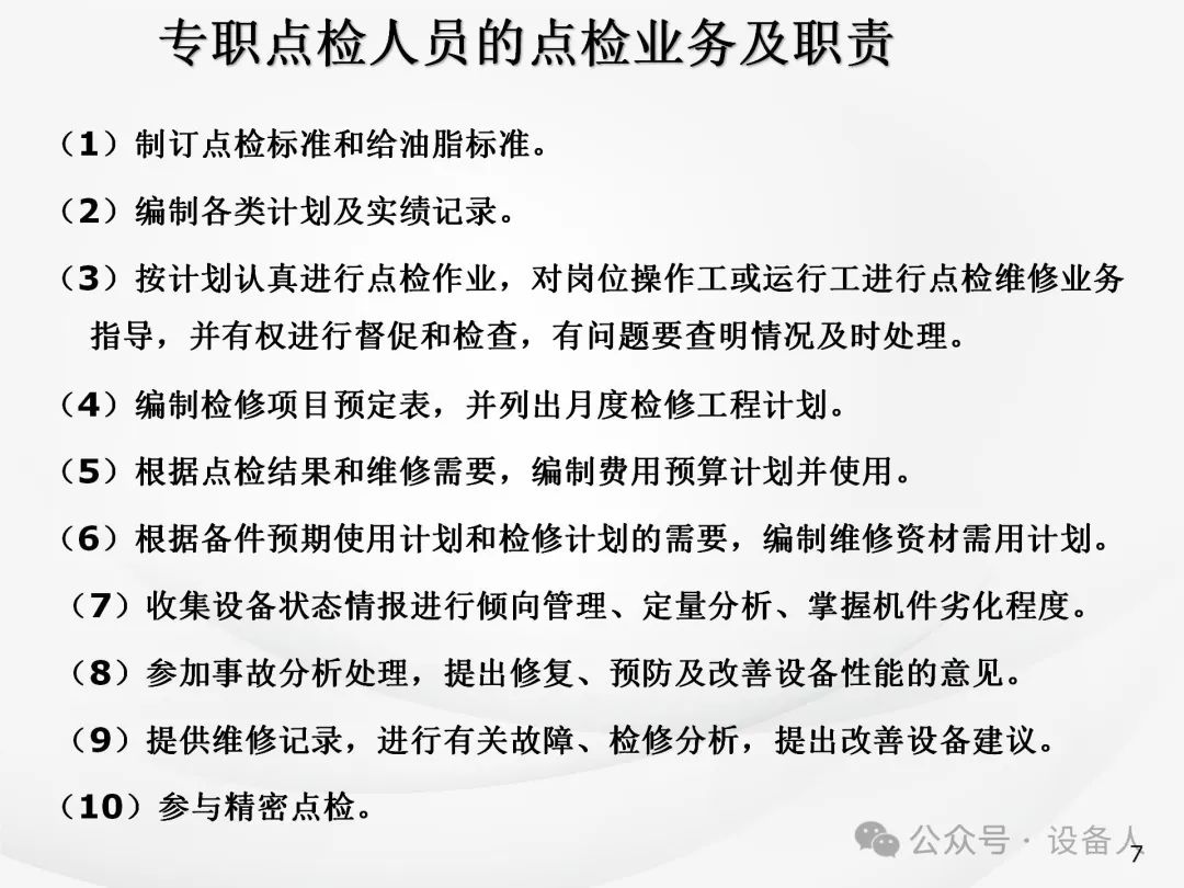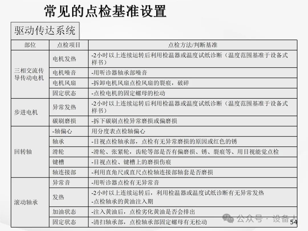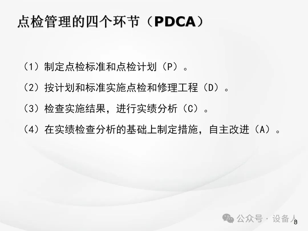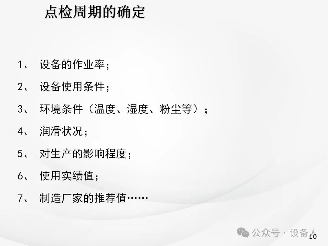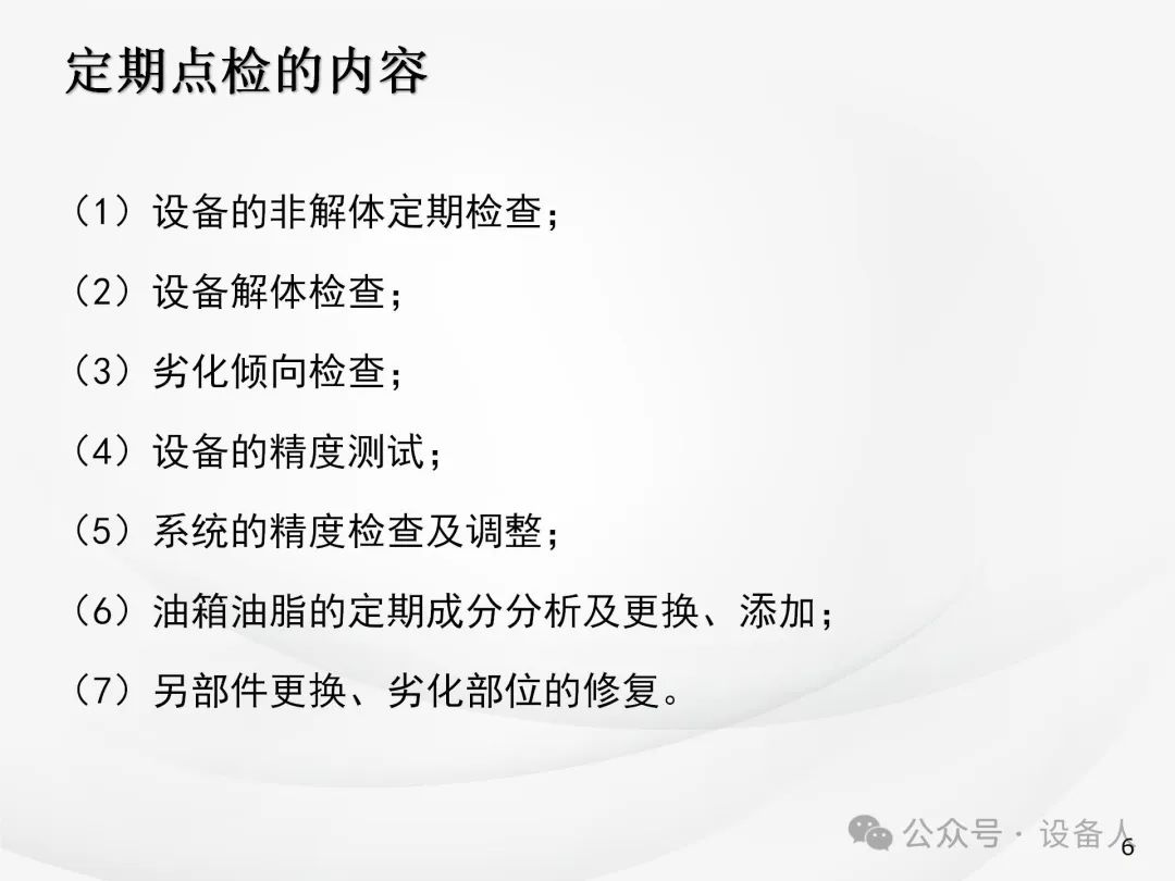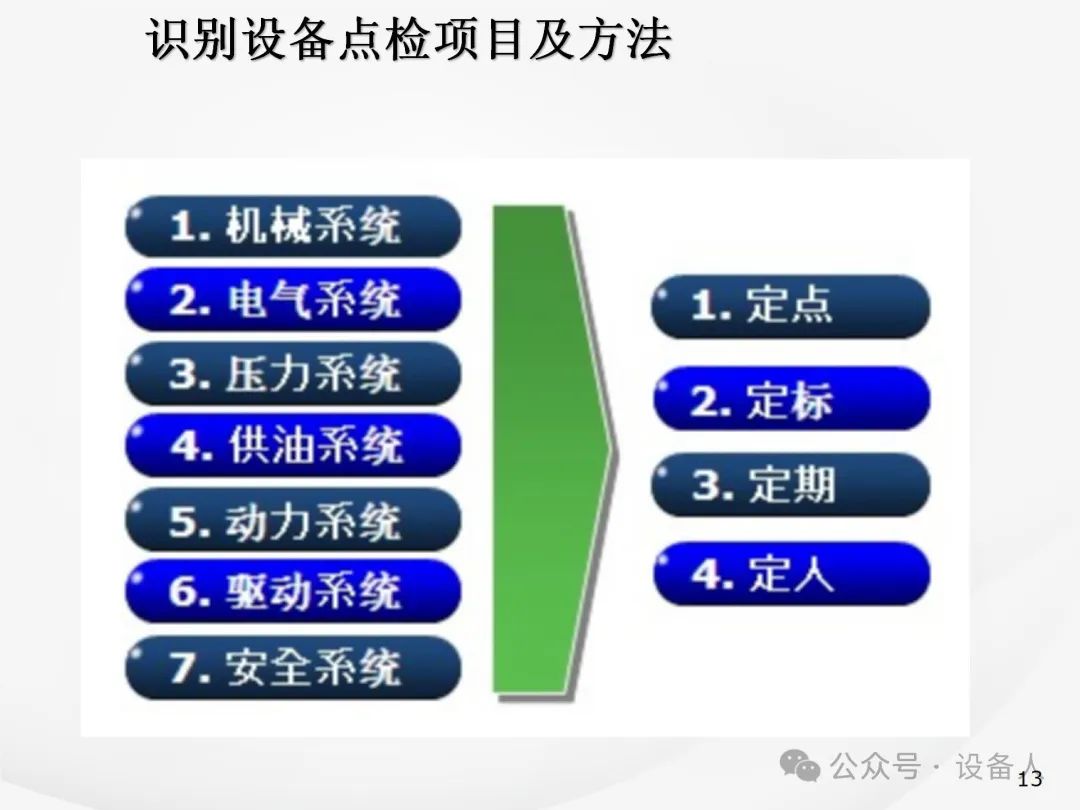 为了维持生产设备的原有性能,通过人的五感(视、听、嗅、味、触)或简单的工具、仪器,按照预先设定的周期和方法,对设备上的规定部位(点)进行有无异常的预防性周密检查的过程,以使设备的隐患和缺陷能够得到早期的发现,早期预防,早期处理,这样的设备检查称为点检。