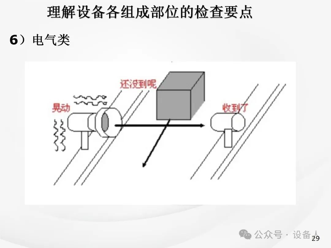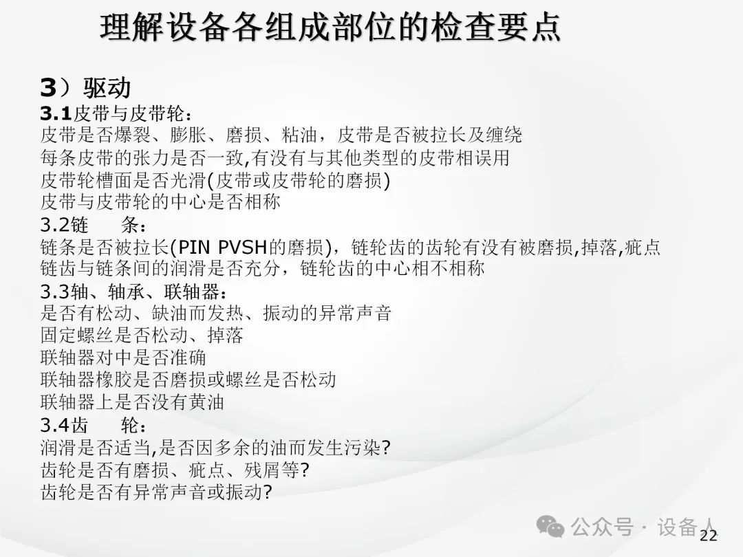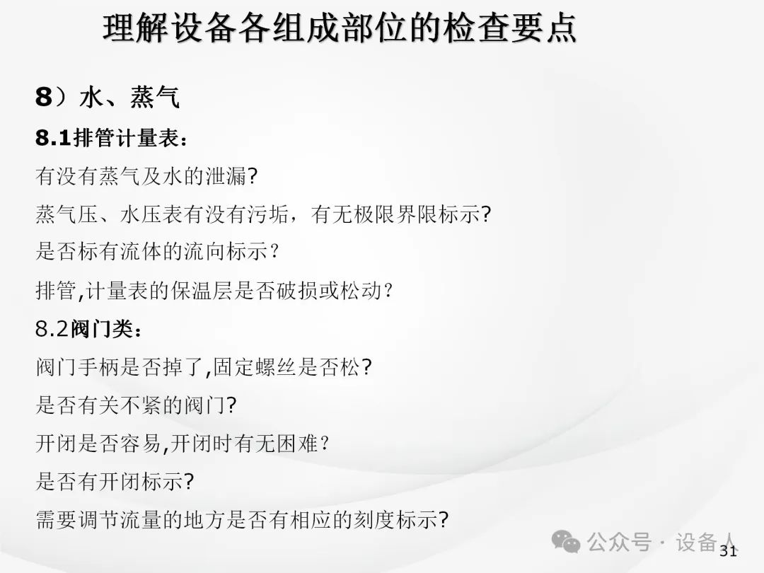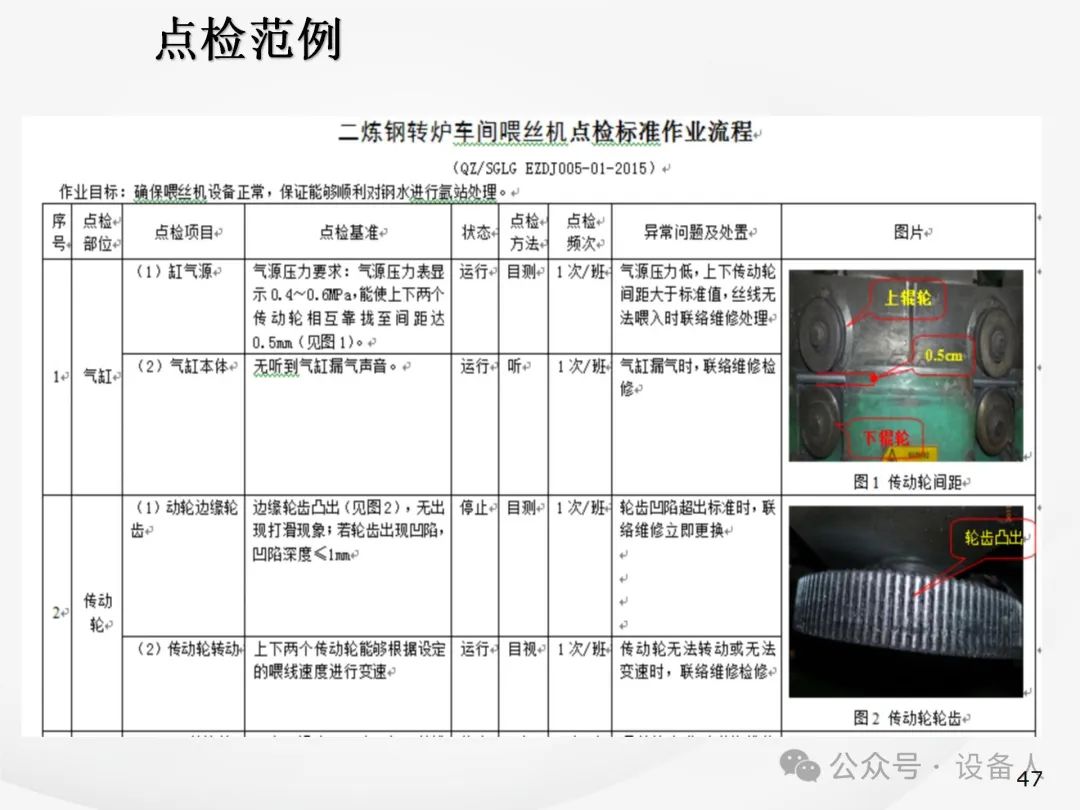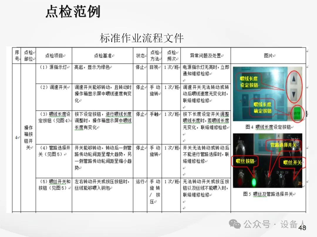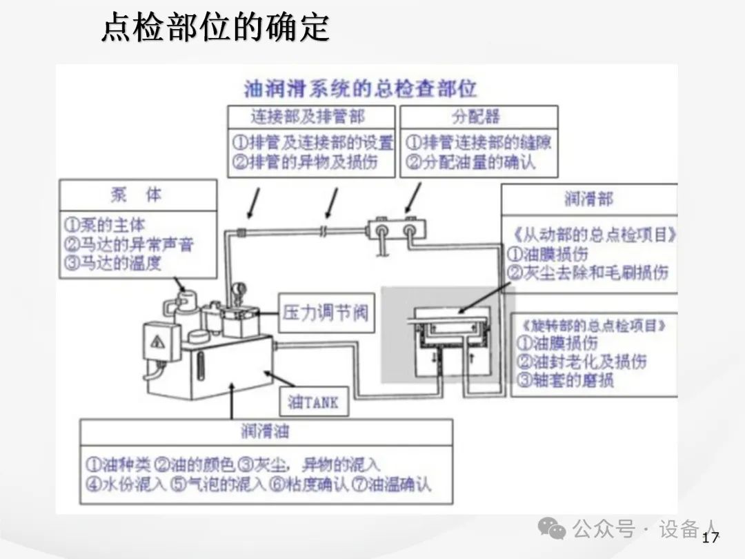为了维持生产设备的原有性能,通过人的五感(视、听、嗅、味、触)或简单的工具、仪器,按照预先设定的周期和方法,对设备上的规定部位(点)进行有无异常的预防性周密检查的过程,以使设备的隐患和缺陷能够得到早期的发现,早期预防,早期处理,这样的设备检查称为点检。