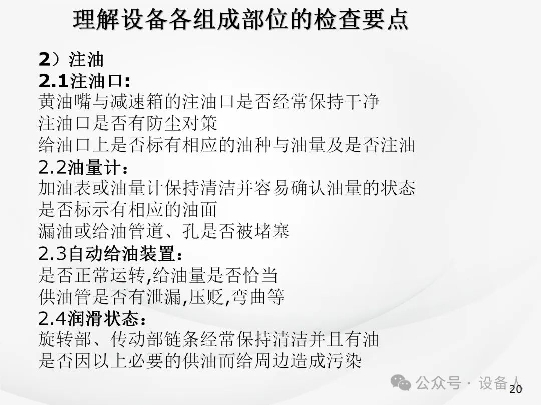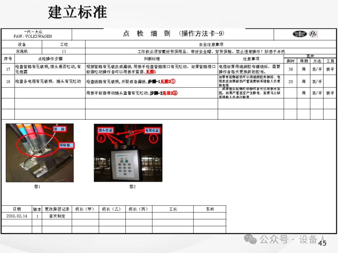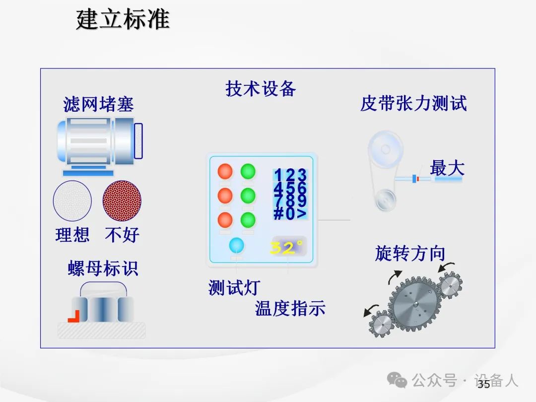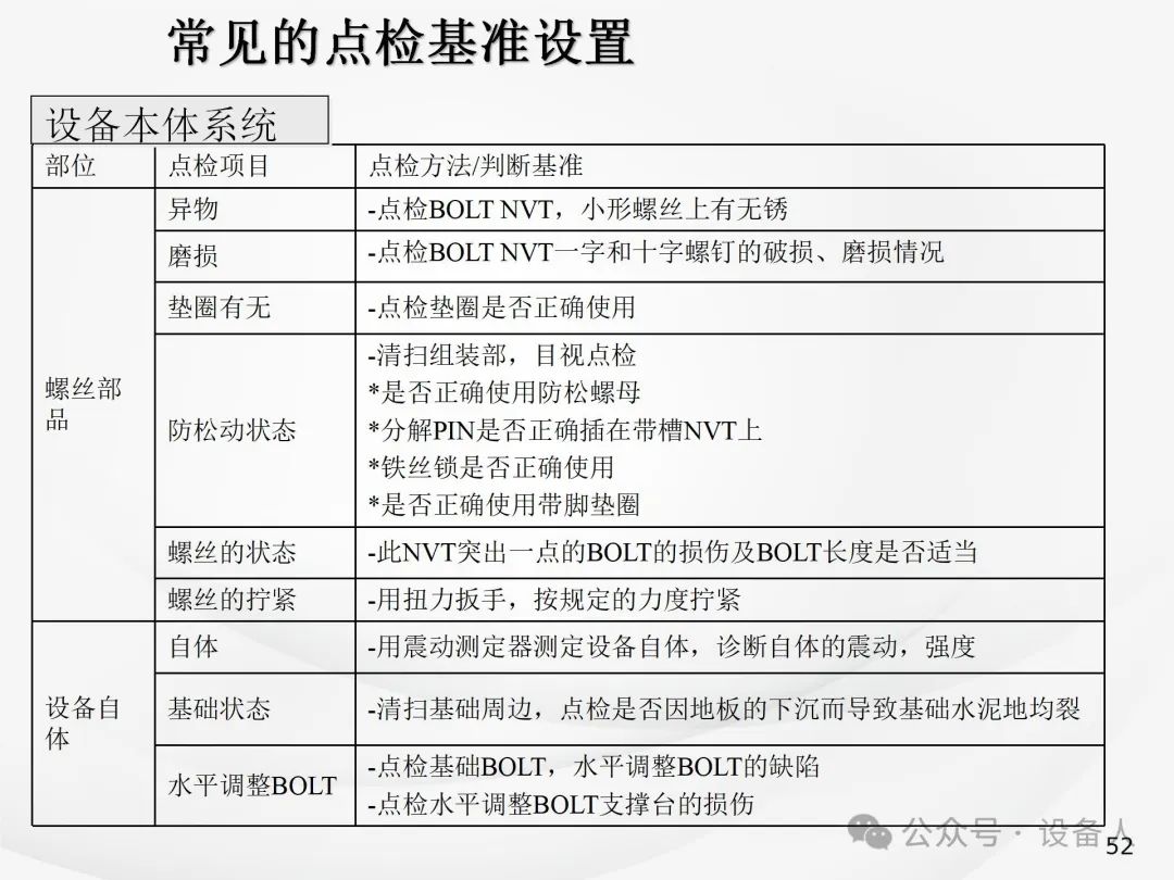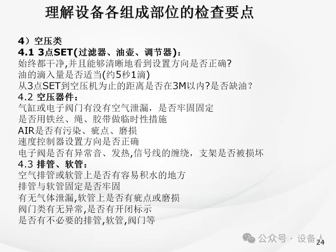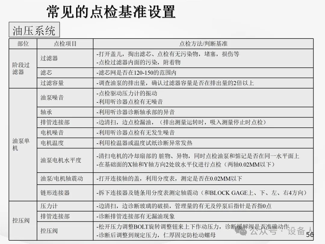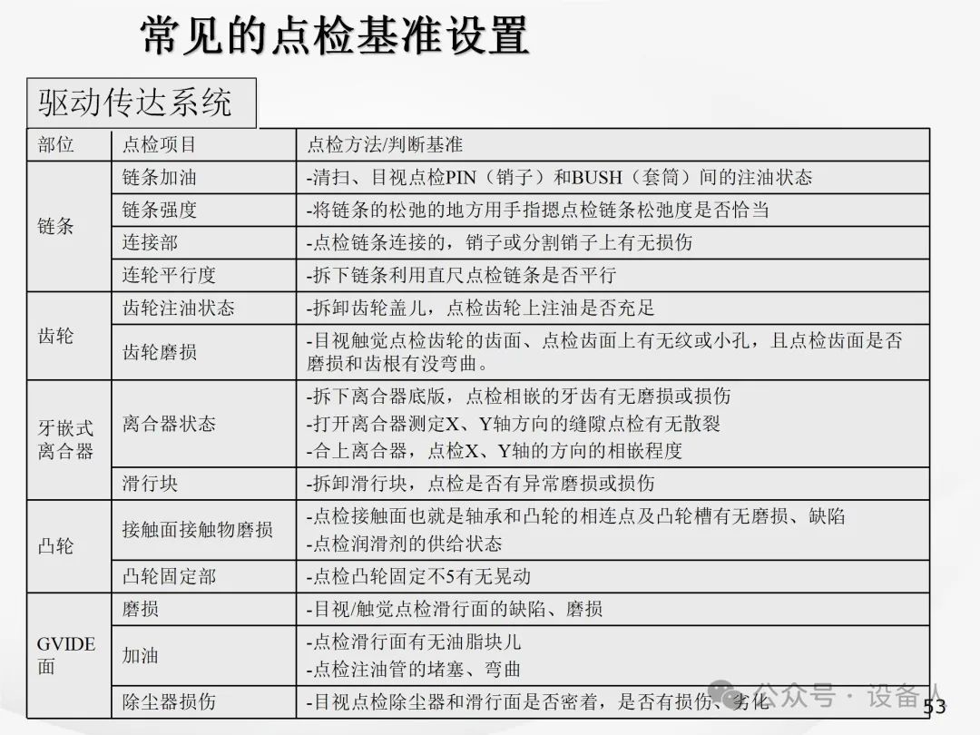 为了维持生产设备的原有性能,通过人的五感(视、听、嗅、味、触)或简单的工具、仪器,按照预先设定的周期和方法,对设备上的规定部位(点)进行有无异常的预防性周密检查的过程,以使设备的隐患和缺陷能够得到早期的发现,早期预防,早期处理,这样的设备检查称为点检。