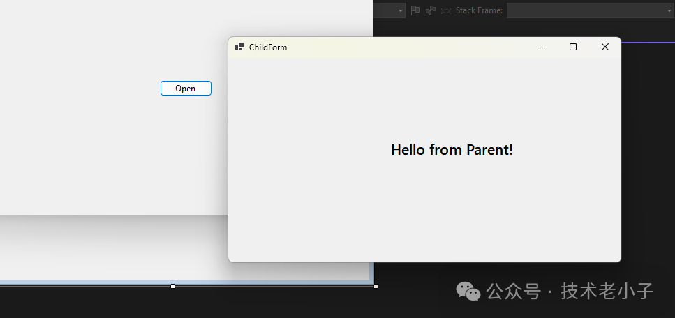 // 父窗体public partial class ParentForm : Form{    private void btnOpenChild_Click(object sender, EventArgs e)    {        ChildForm childForm = new ChildForm();        childForm.Message = "Hello from Parent!";        childForm.Show();    }}