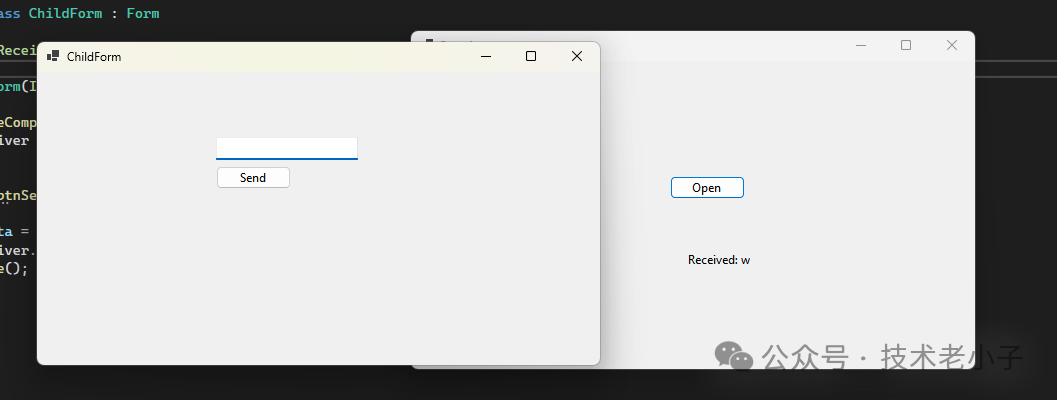 // 父窗体public partial class ParentForm : Form{    private void btnOpenChild_Click(object sender, EventArgs e)    {        ChildForm childForm = new ChildForm();        childForm.DataSent += ChildForm_DataSent;        childForm.Show();    }