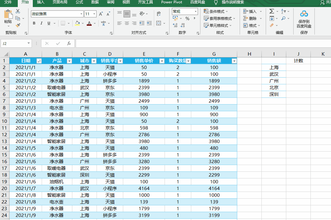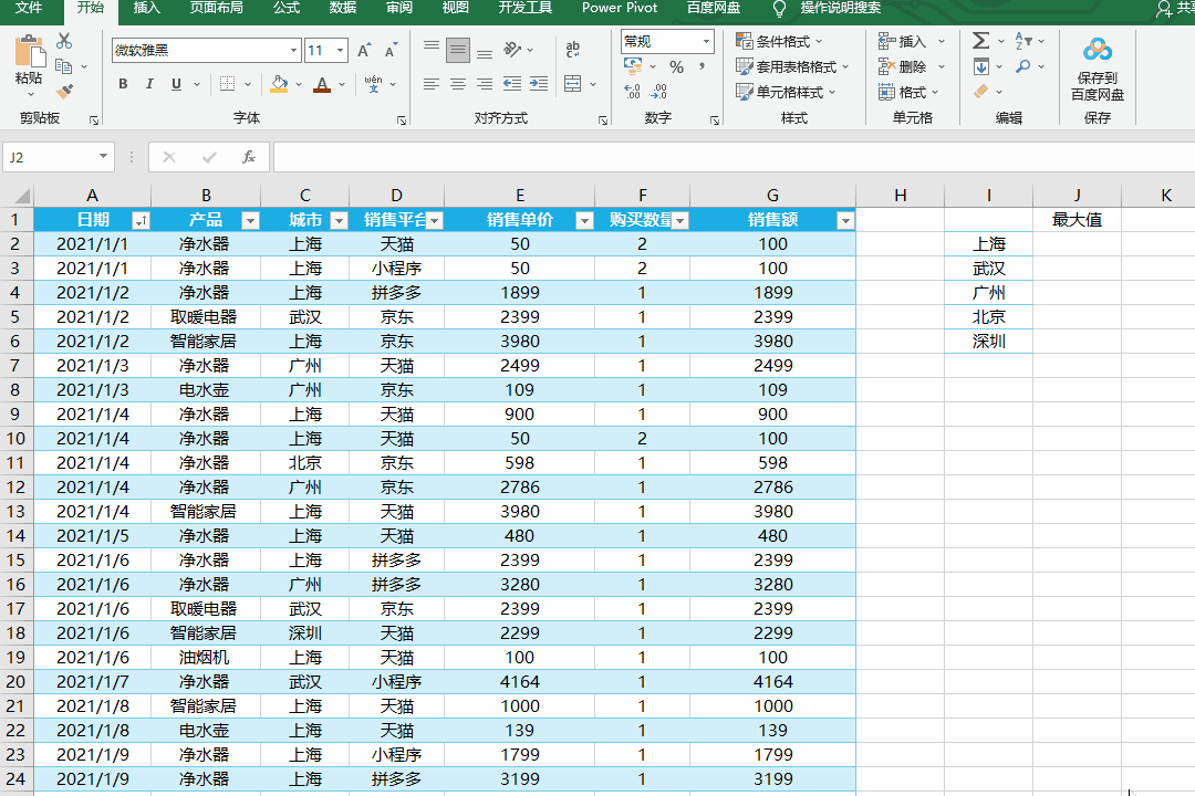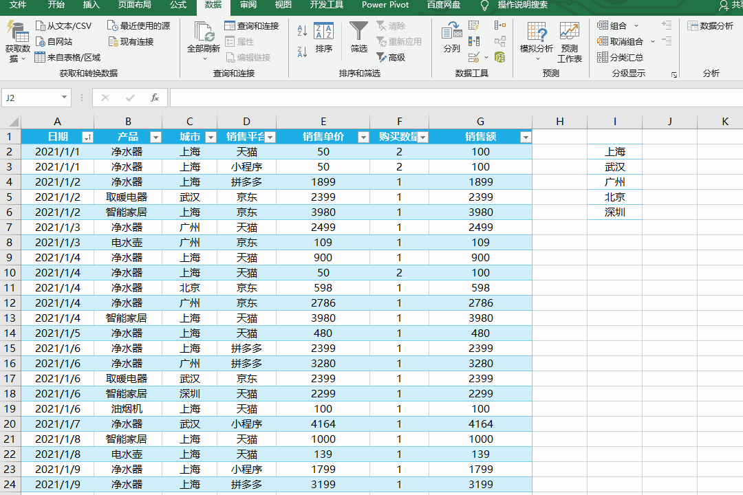 ①首先确定有哪些城市。复制城市列,选择数据-删除重复值,求出每个城市的唯一值。