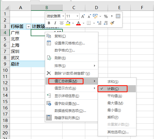把值汇总依据改为计数,这里的计数无法去重。如果需要去重的计数,需要使用到Power Pivot的功能。