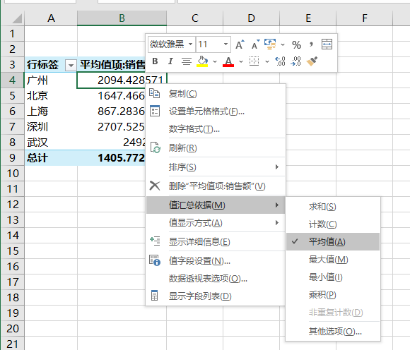 把值汇总依据改为平均值,求出每个城市的每个订单平均消费多少钱。