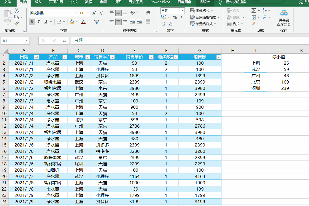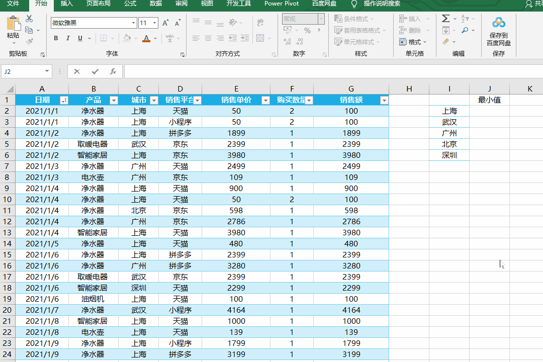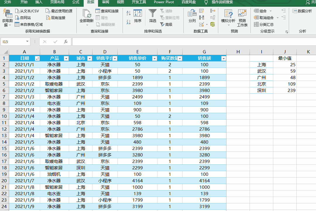 求出每个城市最小的销售额。这2个函数需要2019版本才能使用哈。