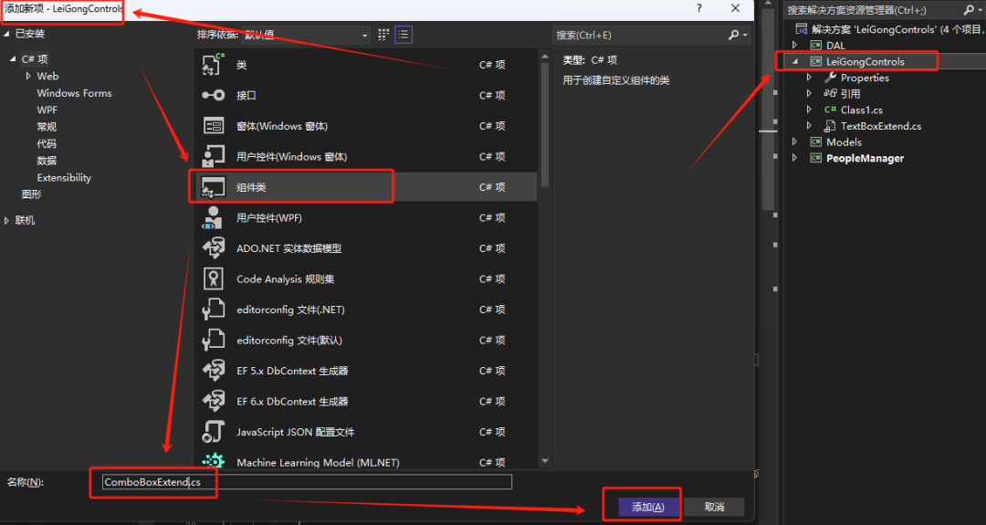 上节的基础上,这里继续在LeiGongCotrols下添加组件类,命名为【ComBoxExtend】。
