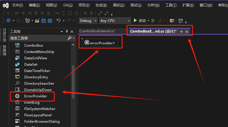 在工具箱中找到ErrorProvider,拖动到设计视图。