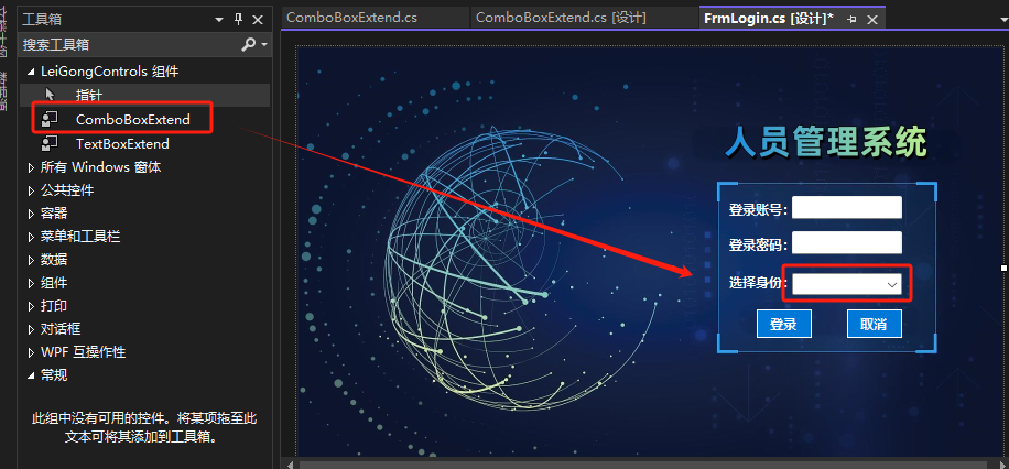 如图将扩展的控件ComboBoxExtend拖到界面中合适的位置。