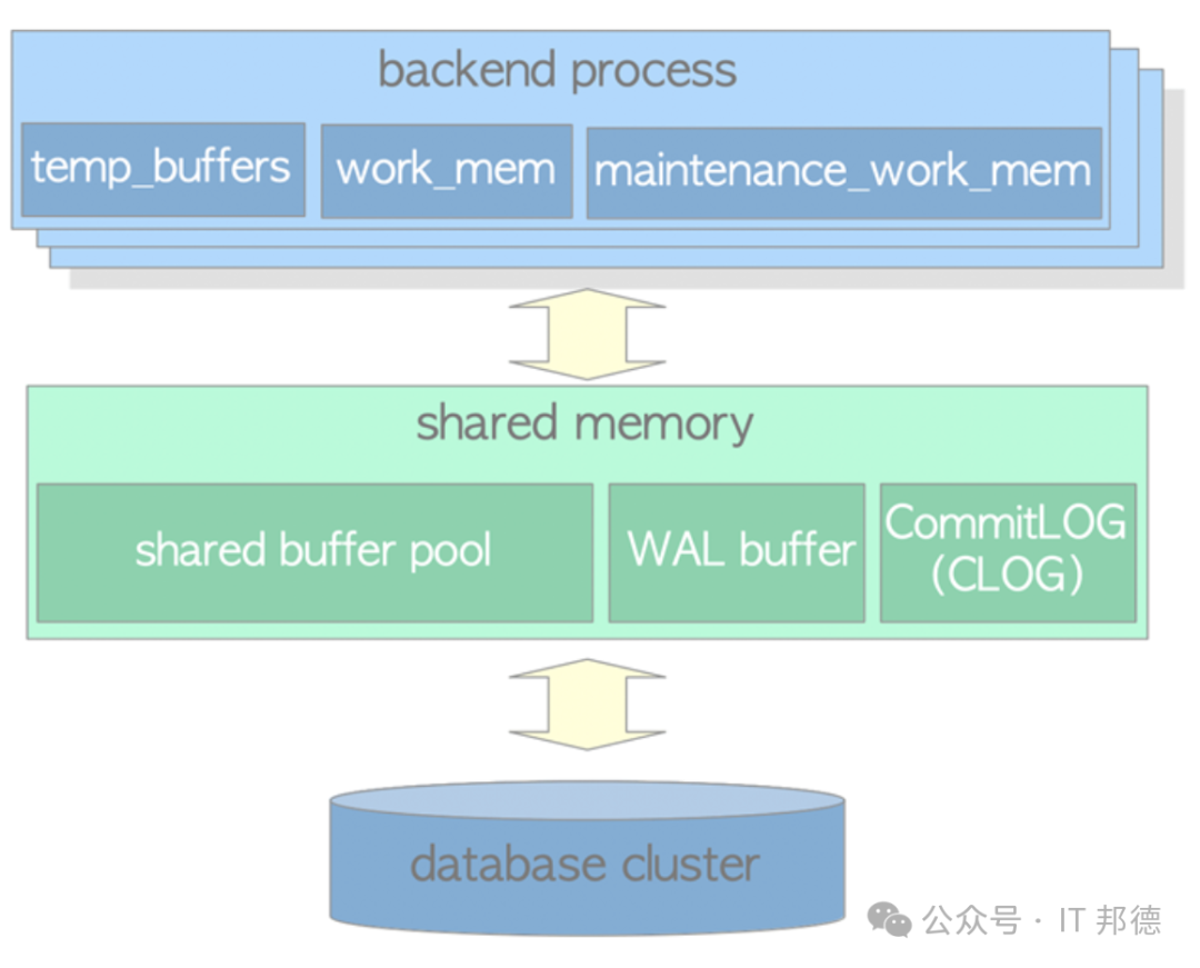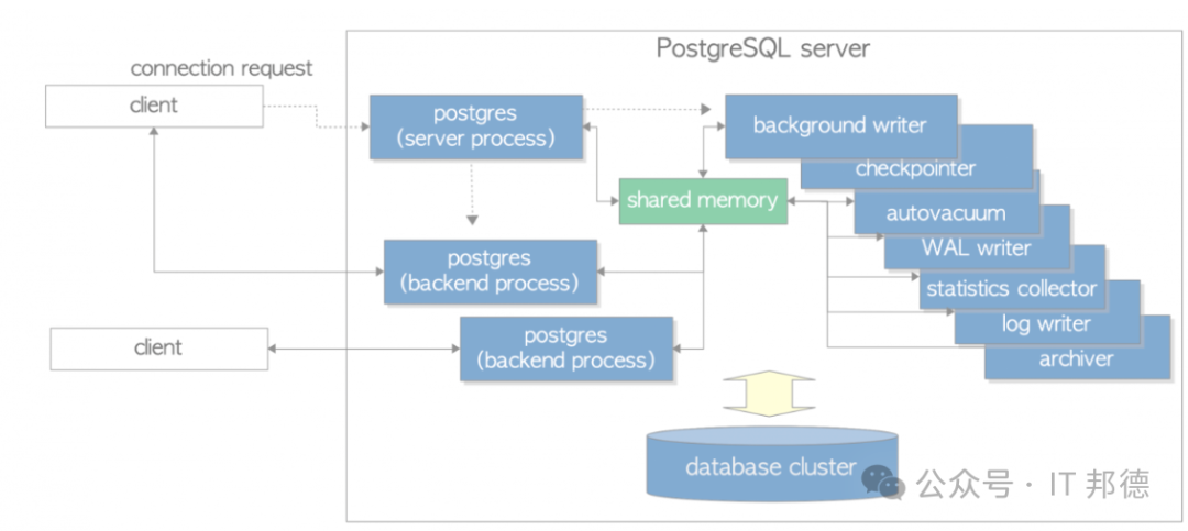 PG是关系型的数据库,是多进程架构,这张图显示了一个PostgreSQL服务器的进程:一个postgres服务器进程,两个backend进程,七个background进程和两个客户端进程。还演示了数据库集群、共享内存和两个客户机进程。
