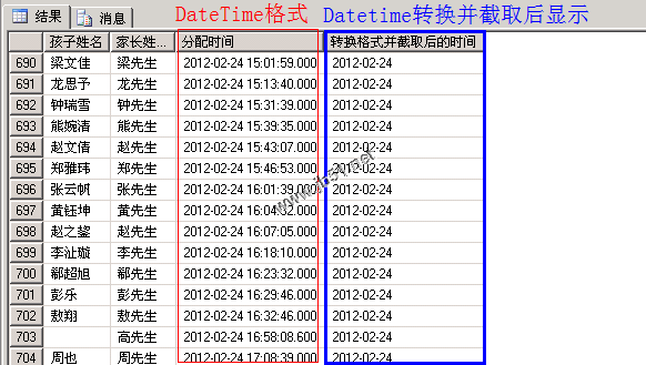 1. select sr_child as '孩子姓名', sr_parents as '家长姓名' ,ss_updatetime as '分配时间', left(ss_updatetime,CHARINDEX(' ',ss_updatetime)-1),SUBSTRING(CONVERT(CHAR(19), ss_updatetime, 120),1,10)as '转换格式并截取后的时间'from dbo.tb_sell_resources,dbo.tb_sell_selldetails where sr_id = ss_rsid and ss_qdstate <> 1 order by ss_updatetime