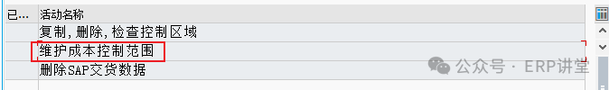 4.会计科目的批量复制: 事务代码:FS15 批量复制适用于源公司代码和目标公司代码使用相同的会计科目表; 5.维护成本控制范围 事务代码:OKKP 系统路径:IMG→控制->一般控制->组织结构->维护成本控制范围 配置目的:维护成本控制范围相关数据 配置屏幕: