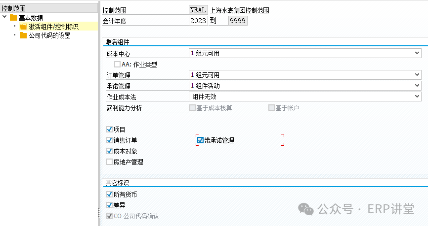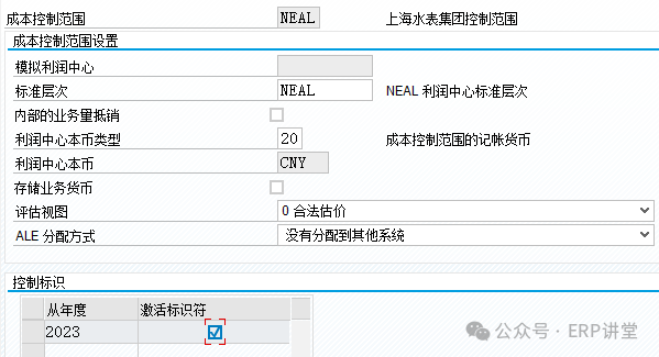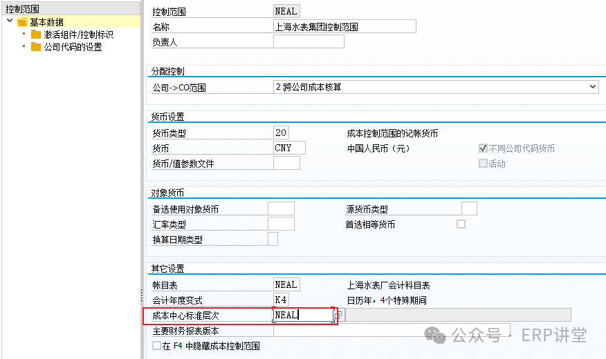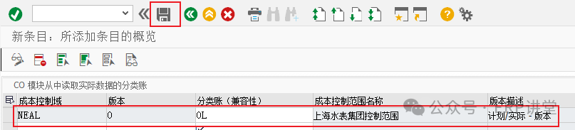 双击成本控制范围: 输入成本中心标准层次,(一般和成本控制范围编码一致) 双击“激活组件/控制标识”: 双击“公司代码的设置”: 6.定义CO版本分类账 事务代码: 系统路径:IMG→控制->一般控制->组织结构->定义CO版本分类账 配置目的:维护FI实际数据同步到CO中对应的版本 配置屏幕: 7.激活利润中心会计 事务代码: 0KE5 系统路径:IMG→控制->利润中心会计->基本设置->成本控制范围设置->维护控制范围设置 配置目的:启用利润中心核算 标准层次:与成本中心类似,利润中心也需要建立唯一的标准层次,从利润核算的角度反映组织架构,所有利润中心都必须被包含在标准层次中,此处定义标准层次的最高节点 内部的业务量抵消:如果选中该标志,则同一利润中心的事务过账将不产生利润中心凭证,例如同属一个利润中心的两个成本中心间的作业分配。 利润中心本币类型:为利润中心会计选择本位币类型,选择"20控制范围货币"或"30集团货币"时系统将控制范围货币或Client货币作为利润中心本位币、选择"90利润中心货币"时需要手工输入利润中心本币。 存储业务货币:如果选中该标志,过账利润中心凭证时系统将同时有储利润中心本位币金额和业务货币金额。 评估视图:用于激活转移价格,有如下三种选项; 0合法评估:不激活转移价格。 1集团评估:激活公司间的转移价格,即扣除内部利润的集团评估 2利润中心评估:激活利润中心间的转移价格,即包含内部利润的利润中心评估 如果进入该步骤配置,不是需要的控制范围,需要先使用OKKS修改默认的控制范围; 8.创建利润中心 事务代码:KE51 修改成本控制范围,输入利润中心代码,点击回车:
