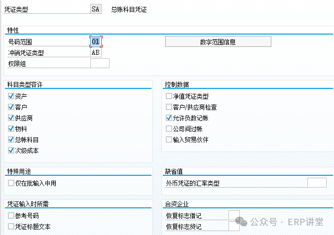 10.定义凭证类型 事务代码:OBA7 系统路径:IMG→财务会计->财务会计全局设置->凭证->凭证类型-> 配置目的:设置凭证类型相关的参数 配置屏幕: 号码范围:财务凭证的编号范围; 冲销凭证类型:冲销该凭证类型的凭证时,生成冲销凭证的凭证类型; 权限组:与用户主数据的权限设定相配合控制只有拥有特定权限的用用户可以过账该凭证类型。 科目类型容许:该类型的凭证中允许过账哪些类型的科目。 净值凭证类型:供应商发票过账时现金折扣是否从应付账款扣减或(现金折扣一般作为财务费用而不从应付账款中扣减)。 客户/供应商检查:控制一个凭证中是否只能使用一个供应商或客户。 允许负数记账:是否允许反记账(必须选则) 公司间过账:控制在会计凭证中是否允许输入两个或两个以上贸易伙半(即使不勾选本标记也可以跨公司代码记账) 贸易伙伴:控制是否可以手工输入贸易伙伴; 凭证输入时所需:控制这两个字段是否必输; 仅在批输入中用:不用直接记账,必须通过批处理程序记账; 外币凭证的汇率类型:如果设置,对应的凭证优先使用这里的汇率类型对应的汇率记账;
