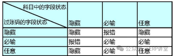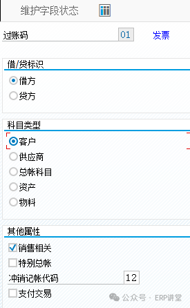由来自科目主数据的字段状态变式和来自过账码的字段状态共同控制会计凭证各字段的输入状态,双重控制系统逻辑: 客户记账:(01-19)【0开头:借方;】【1开头:贷方】 供应商记账:(21-39)【2开头:借方;】【3开头:贷方】 总账记账:(40,50)【40 借方;50贷方】 资产记账:(70.75)【70 借方;75贷方】 物料记账:(81-99)【8开头:借方;】【9开头:贷方】