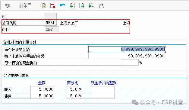 每个凭证的金额:允许过账会计凭证的最大金额。 每个未清账户项目的金额:允许过账的未清项(如应收应付账款行项目)的最大金额。 每个行项的现金折扣:每个应收应付发票或收付款清账时允许的最大现金折扣比率。 允许的支付差额-金额/百分比:即收付款清账时允许的最大差异,在该差异内系统自动将差异金额过账到预设的损益科目。金额和百分比同时设定的情况下以容差范围小的为准。 允许的支付差额-现金折扣调整到:在设定金额内的容差会被自动调整为现金折扣项目。 点晴模切ERP更多信息:http://moqie.clicksun.cn,联系电话:4001861886 该文章在 2024/10/9 11:54:51 编辑过 |