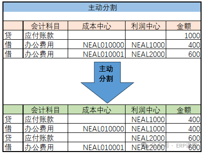 凭证分割的基本方式: 主动分割:基于系统配置的分割规则,自动分割凭证行项目;例如,供应商发票记账,供应商行项目对应多条费用发票或者采购发票,这种情况下在供应商行项目无利润中心信息,那么系统会依照系统配置的分割规则根据费用科目的金额比例对供应商行项目余额进行拆分。