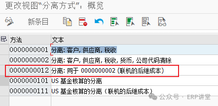 凭证分割相关配置 : 1.定义凭证分割方法: 事务代码:SM30 - V_T8G01 系统路径:IMG→财务会计->总账会计->业务交易->凭证拆分->扩展凭证拆分->定义凭证拆分方法 配置目的:维护凭证分割的方法 配置屏幕: 一般使用标准的分割方法0000000012,如果客户有特殊需求,也可以新建新的分割方法;(学校的系统大家不要新建新的,会影响其他同学测试)