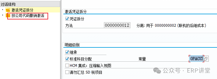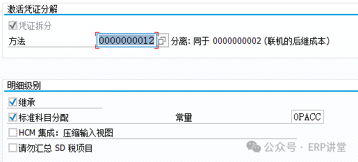 凭证拆分:选中该标志标识系统激活凭证分割,凭证分割时Client级别的激活。 方法:指定凭证分割使用的方法; 继承:将含有分割特征行项目的分割特征拷贝到不含分割特征的行项目,必须选中该标志。(被动分割) 标准科目分配/常量:为无法确定分割特征的凭证行项目指定默认的分割特征(利润中心);
